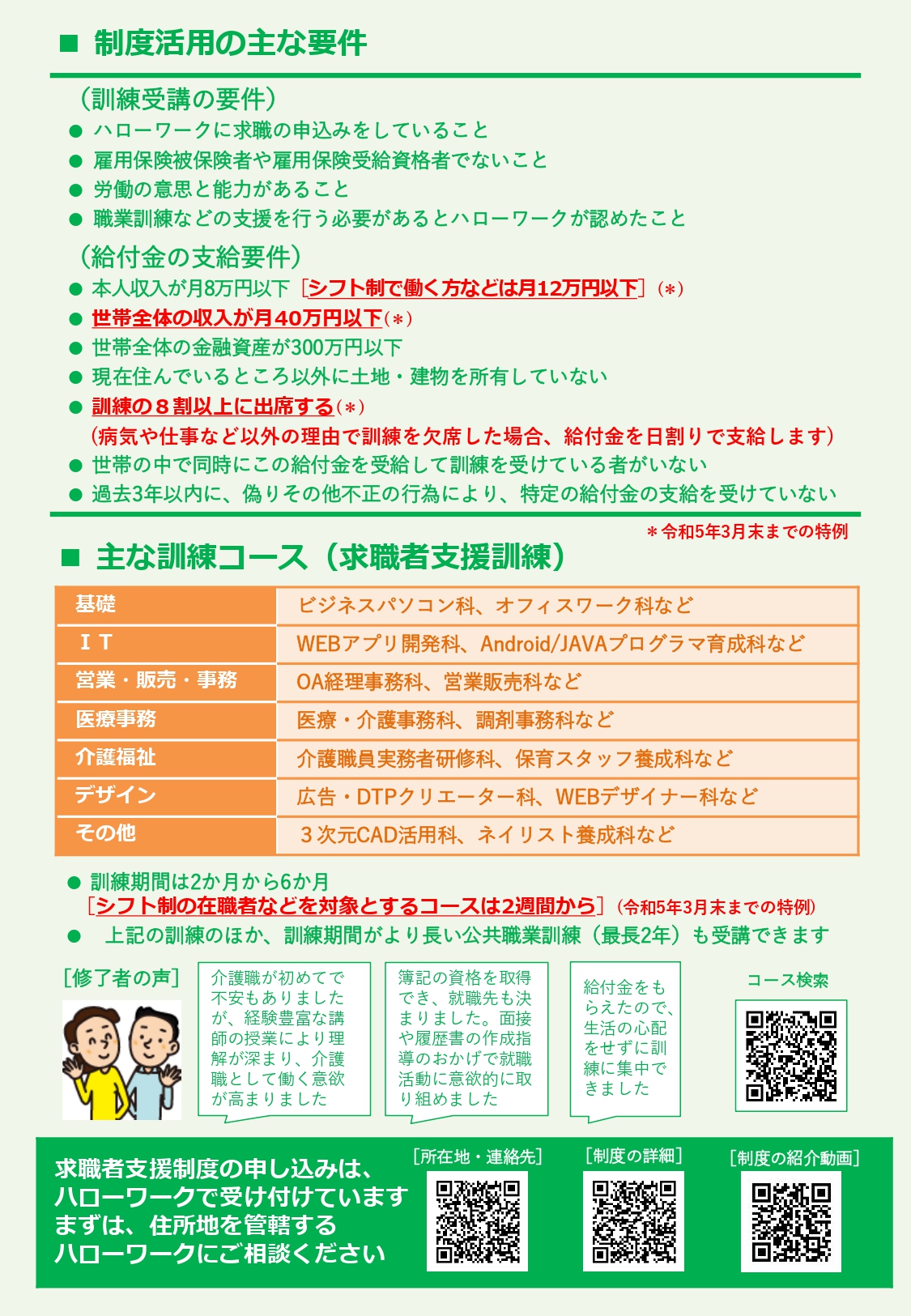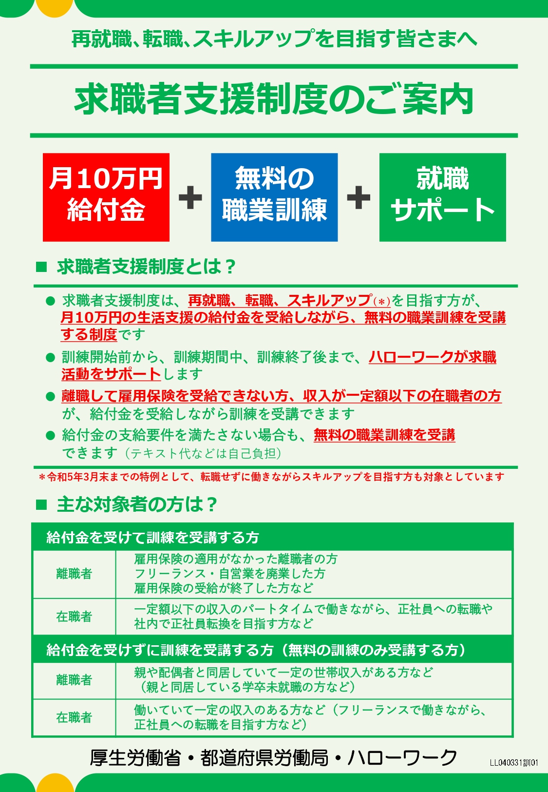 求職者支援制度は、雇用保険を受給できない求職者の方が、月10まん延の生活支援の給付金を受給しながら、無料の職業訓練(求職者支援訓練)を受講する制度です。