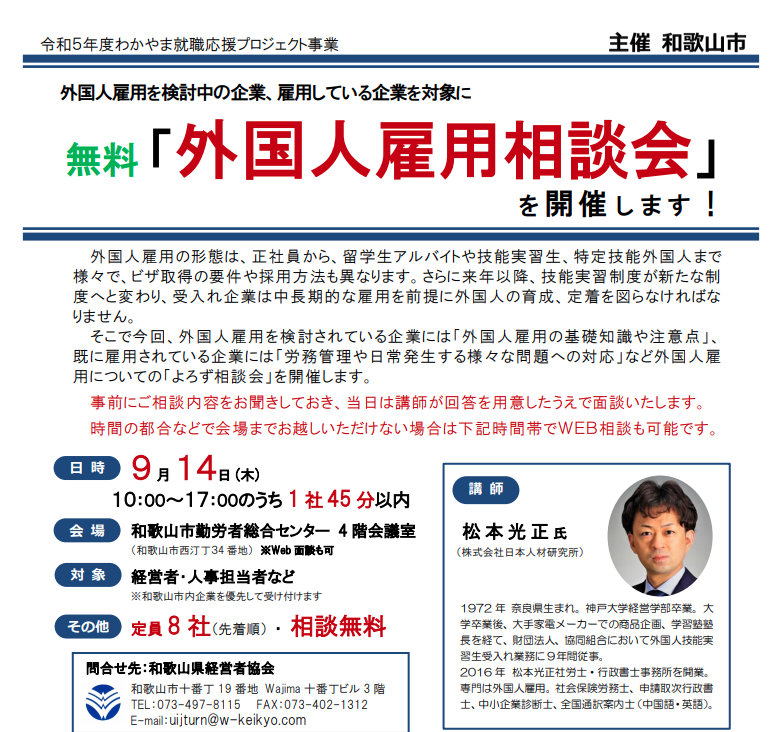 外国人雇用を検討中の企業には「外国人雇用の基礎知識や注意点」、既に雇用されている企業には「労務管理や日常発生する様々な問題への対応」など外国人雇用についての「よろず相談会」を開催します。絶好の機会ですので、ぜひご参加下さい!